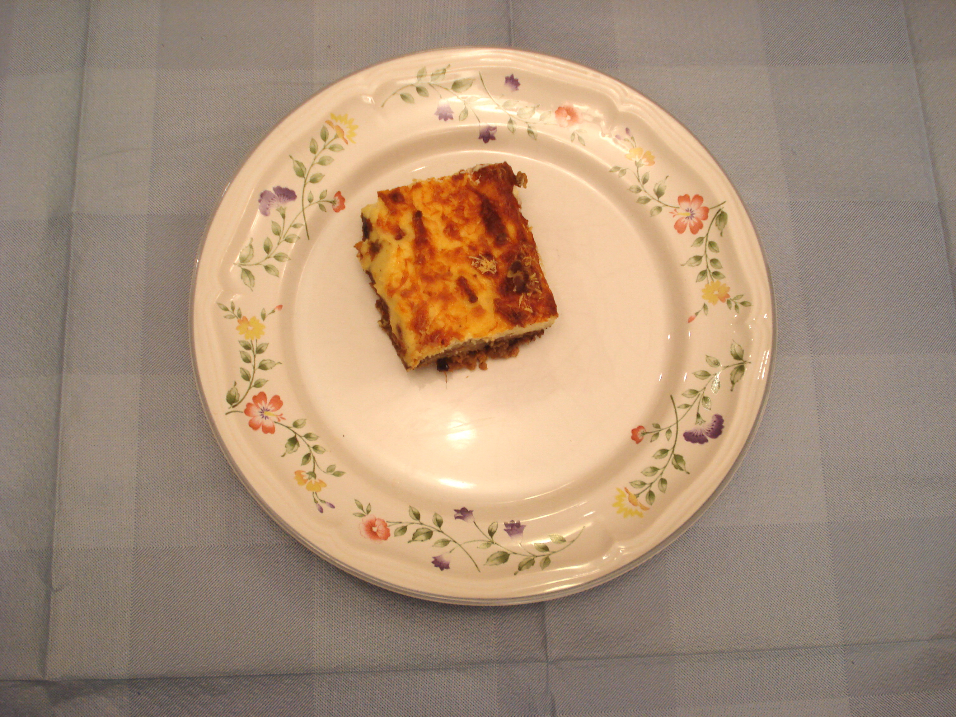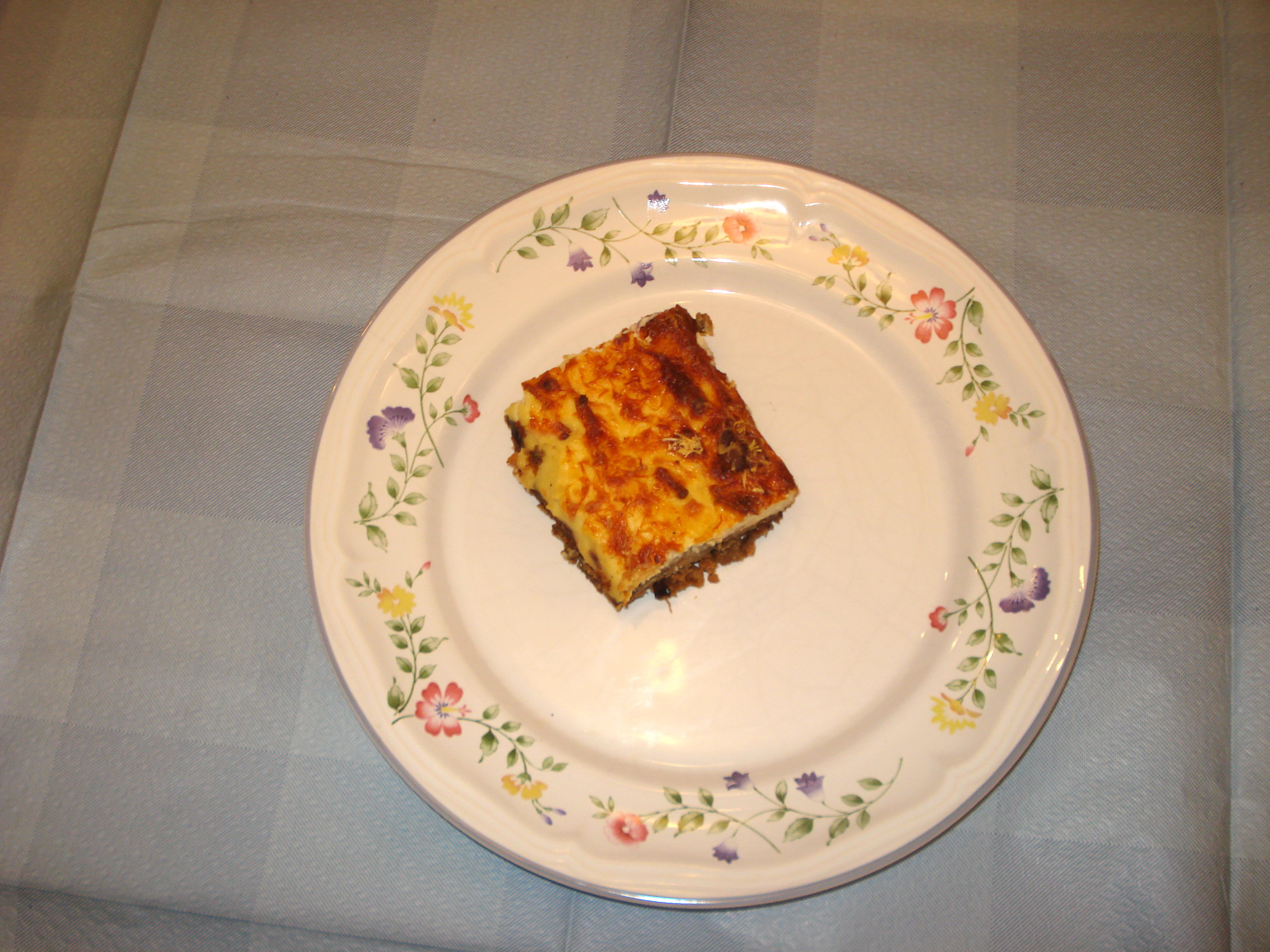 - Απλώνουμε την μπεσαμέλ στο μουσακά και ρίχνουμε από πάνω την τριμμένη γραβιέρα.